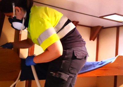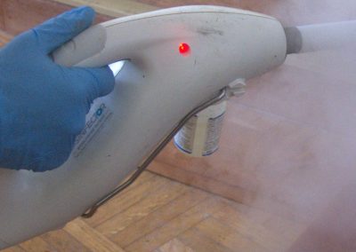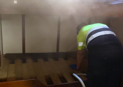 Para la eliminación de las chinches de cama utilizamos fundamentalmente el aspirado meticuloso de aquellos puntos que se determinan críticos, así como la aplicación de vapor seco, tal como muestran las fotografías, para conseguir el exterminio mediante temperatura, que acompañamos en algún punto con insecticida dadas las condiciones concretas de realización del trabajo, que nos obligaban a lograrlo en un plazo de tiempo tasado.