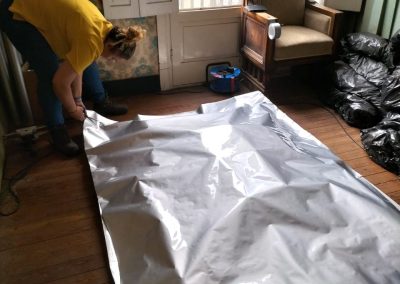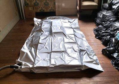 Introducimos as pezas (neste caso tomos, pero poderían ser outro tipo de obxectos) nunha burbulla de baixa permeabilidade ao oxíxeno que imos construíndo a medida. No interior da burbulla introducimos sacos inhibidores de oxíxeno, apoiados por bolsas de control da humidade, que han de conseguir crear esas condicións de atmosfera pretendidas, nas que os insectos morren por anoxia. Para asegurar que se dan estas condicións, realizamos unha supervisión desde o exterior por medio de sondas que nos permiten controlar os índices no nivel pretendido. Para esta monitorización axudámonos dun dispositivo de control Smart Anoxia a través do que podemos inspeccionar a actuación a distancia.