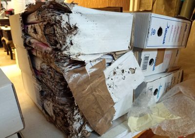 O que si resultou curioso foi comprobar como os térmites estaban na zona de arquivo atacando tamén a documentación impresa que alí se gardaba. Esta circunstancia en realidade non ten nada de sorprendente, dado que estes insectos sociais se alimentan de celulosa, e, se ben, é na madeira ou no algodón onde máis poden atopar, tamén se alimentan de papel e de cartón. Como podedes apreciar nas fotografías algúns destes A-Z presentaban xa un estado de avanzada deterioración que era imperativo deter.